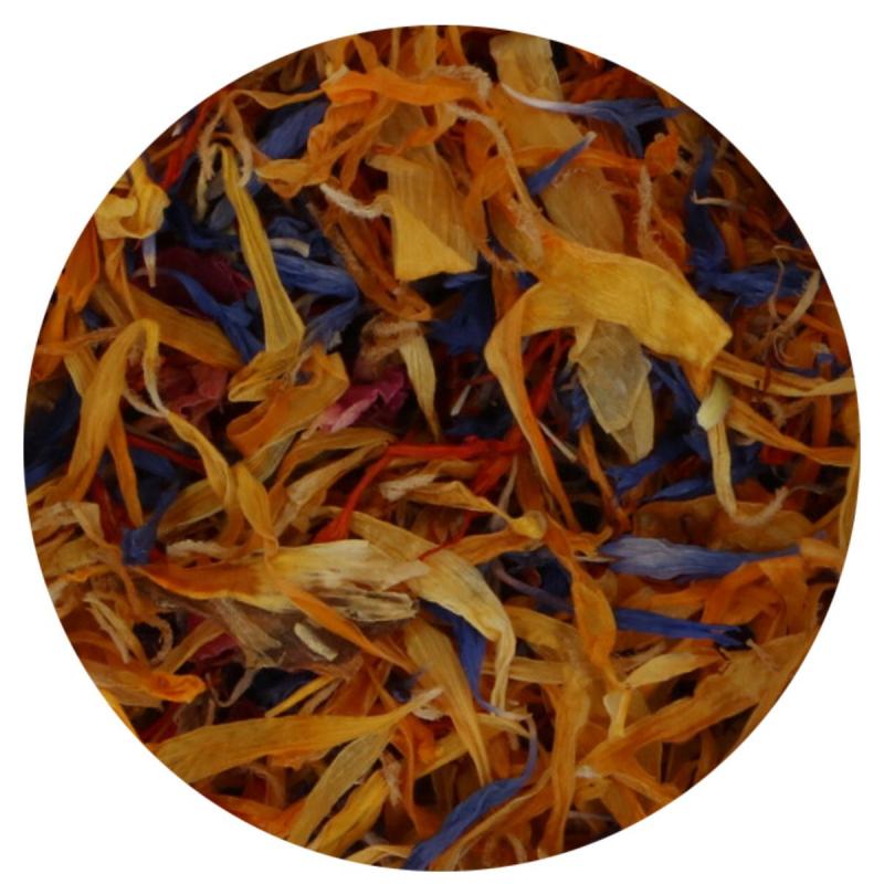Vyrobené zo 100 % sušených kvetov. Skladovanie: Skladujte na chladnom a suchom mieste. Chráňte pred slnečným žiarením a nevystavujte teplotám nad 50 °C. Trvanlivosť: 365 dní. Balenie: Balené v priehľadnej plastovej nádobe s bezpečnostným uzáverom a etiketou. Zloženie: Okvetné lístky ruží (sušené), kvety nechtíka lekárskeho (sušené), nevädze (sušené), svetlica farbiarska (sušená). Tento produkt je: vhodný pre vegetariánov, vhodný pre vegánov. Čistý obsah: 5 g. Obsahuje zanedbateľné množstvo energie, tuku, sacharidov, cukrov, bielkovín a soli.